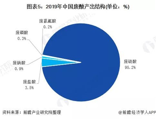廢硫酸為主要主要廢酸產(chǎn)出種類,2019年,廢硫酸產(chǎn)出量為9020萬(wàn)噸左右,占廢酸產(chǎn)出量的95.2%。
