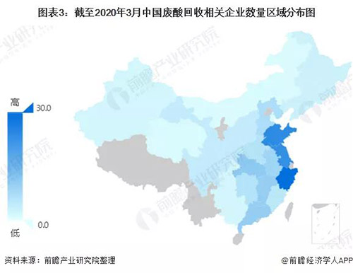 По состоянию на март 2020 года в Китае насчитывается 177 предприятий, связанных с утилизацией отходов кислоты, из которых три провинции Чжэцзян, Шаньдун и Цзянсу занимают первые три места по количеству предприятий по утилизации отходов кислоты, 30, 24 и 23 соответственно.