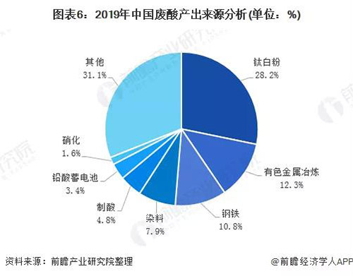 Основными отраслями, производящими отработанные кислоты, являются производство титанового порошка методом сульфата, производство серной кислоты, металлургическая промышленность цветных металлов и металлургическая промышленность. В 2019 году объем производства отработанной кислоты в титановой порошковой промышленности составил около 26,75 млн. тонн, что составляет 28,2% от общего объема производства отработанной кислоты; Производство отработанной кислоты в цветной металлургии составляет около 11,63 млн. тонн, что составляет 12,3% от общего объема производства отработанной кислоты.