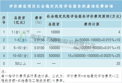 Сборы за консультации по оценке рисков социальной стабильности могут быть основаны на местных тарифных стандартах, таких как Шанхайский местный стандарт - « Временный стандарт платы за консультационные услуги по оценке рисков социальной стабильности для ключевых строительных проектов в Шанхае» (Shanghai Development Reformation Investment [2012] 130), чтобы оценить общий объем инвестиций в качестве базы расчета, в соответствии с различным характером, содержанием и регионом строительного проекта, принять фиксированную ставку в соответствии с оценочной суммой инвестиций.